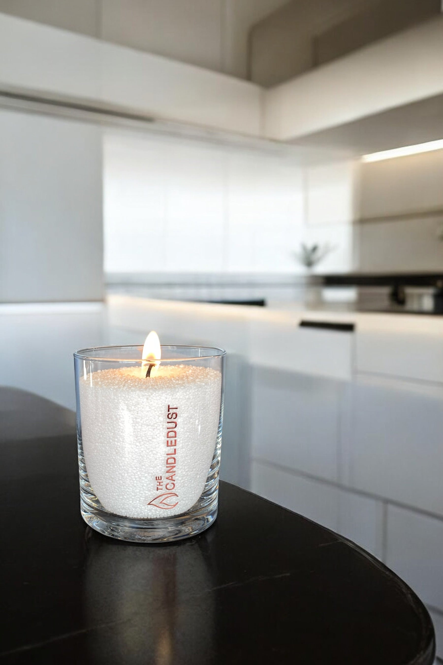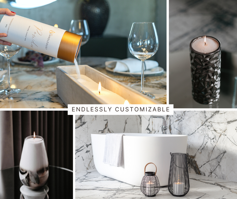 Pulveret sætter sig naturligt i sin beholder, hvilket gør lyset blødt, fleksibelt og roligt. Når stearinlyset er brændt ned, kan det resterende pulver genbruges og omformes.